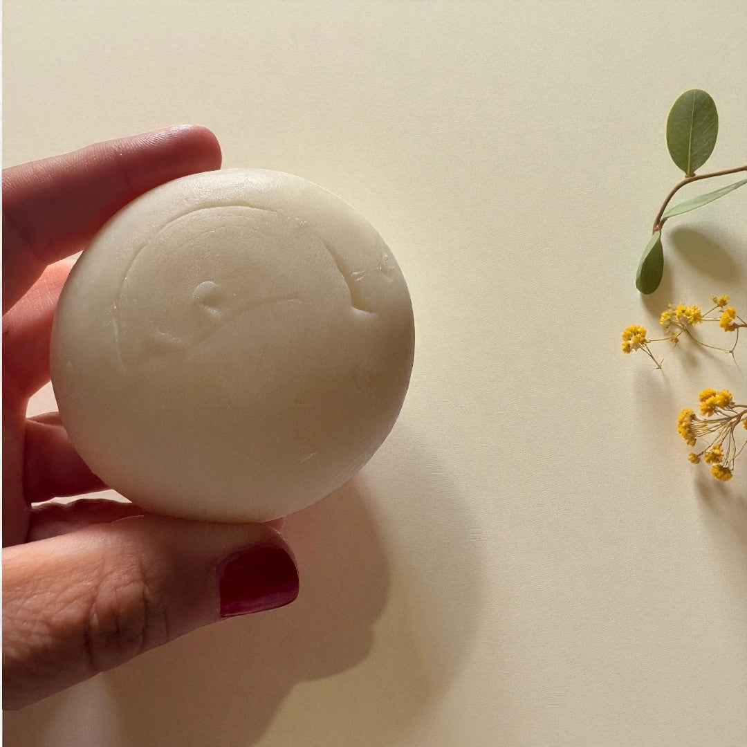 1. Humedece el acondicionador sólido y frótalo entre las manos o directamente sobre el cabello mojado.